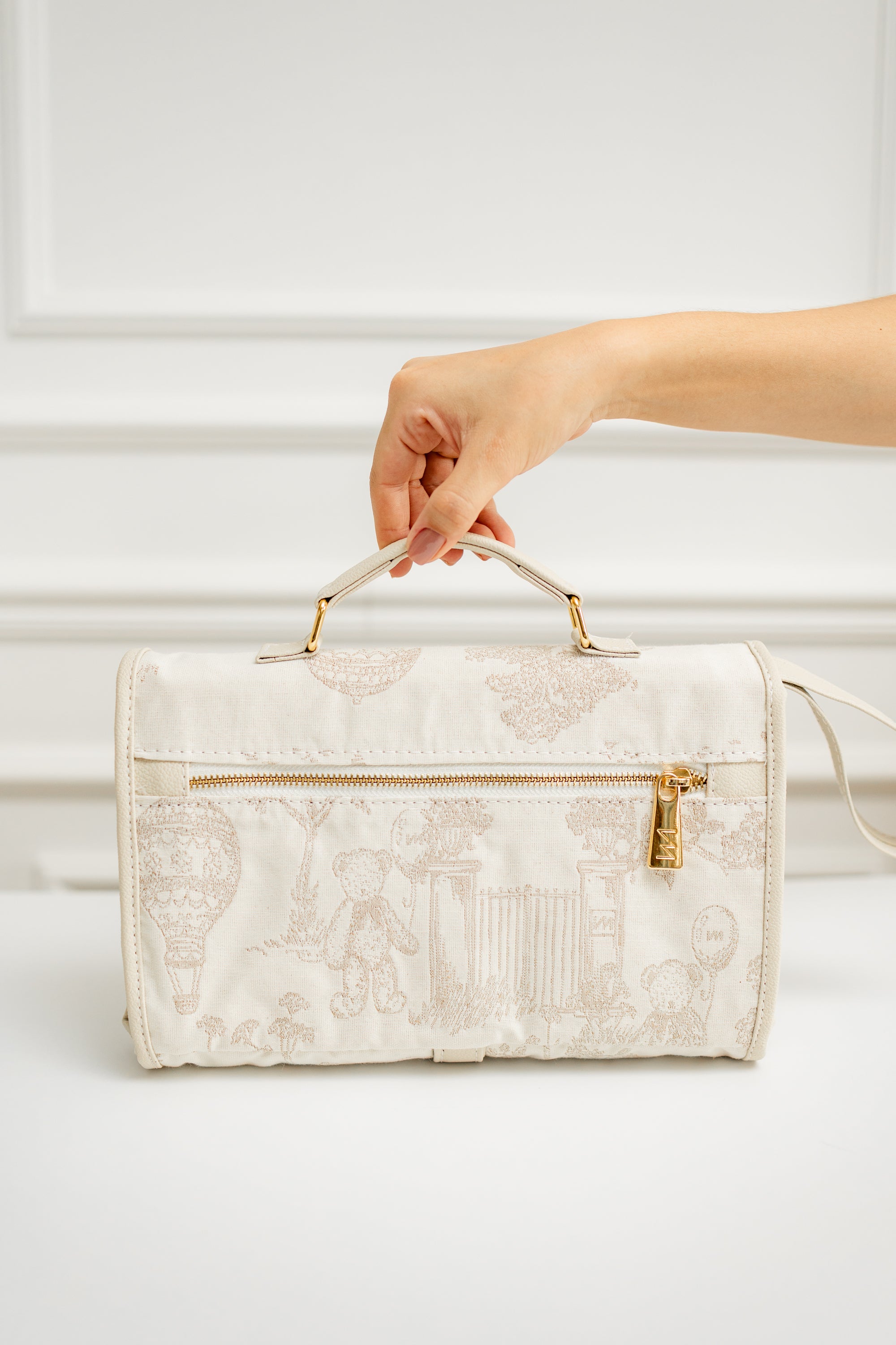 Trocador portátil da coleção Le Petit Bege, confeccionado em tecido jacquard exclusivo, leve e resistente. Com vários repartimentos internos, é perfeito para organizar troca de roupinha, fralda e pomada. Pode ser usado sozinho ou dentro de uma bolsa maior, facilitando as saídas rápidas e emergências dos pais.
