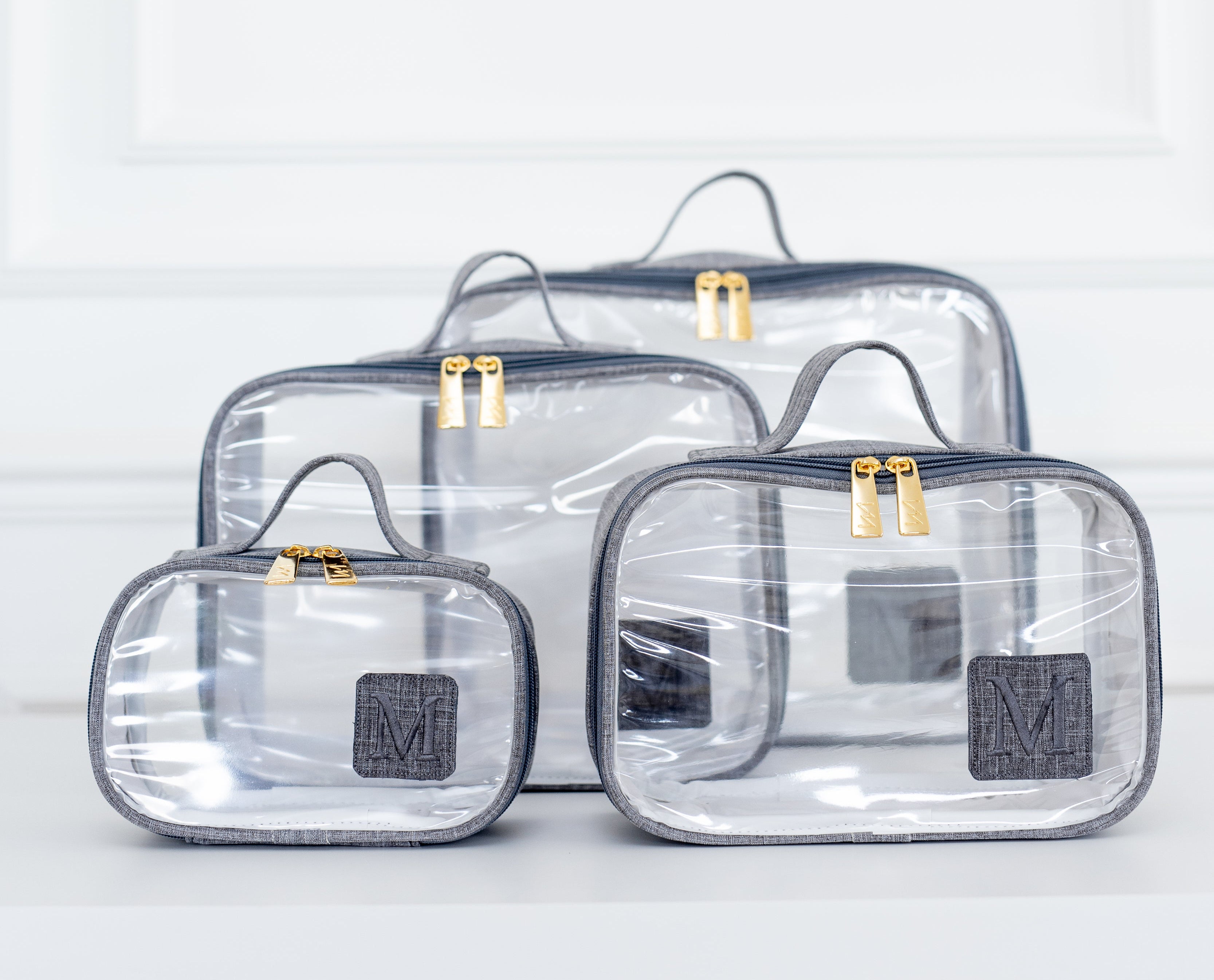 O Kit Nécessaire Cristal da coleção Nós Cinza é composto por 4 peças nos tamanhos PP, P, M e G. Com frente e verso em plástico transparente, são ideais para visualizar e organizar roupinhas, acessórios e itens de higiene. Práticos, impermeáveis e sofisticados, servem tanto para a maternidade quanto para o uso das mamães no dia a dia. Personalizáveis com iniciais bordadas.