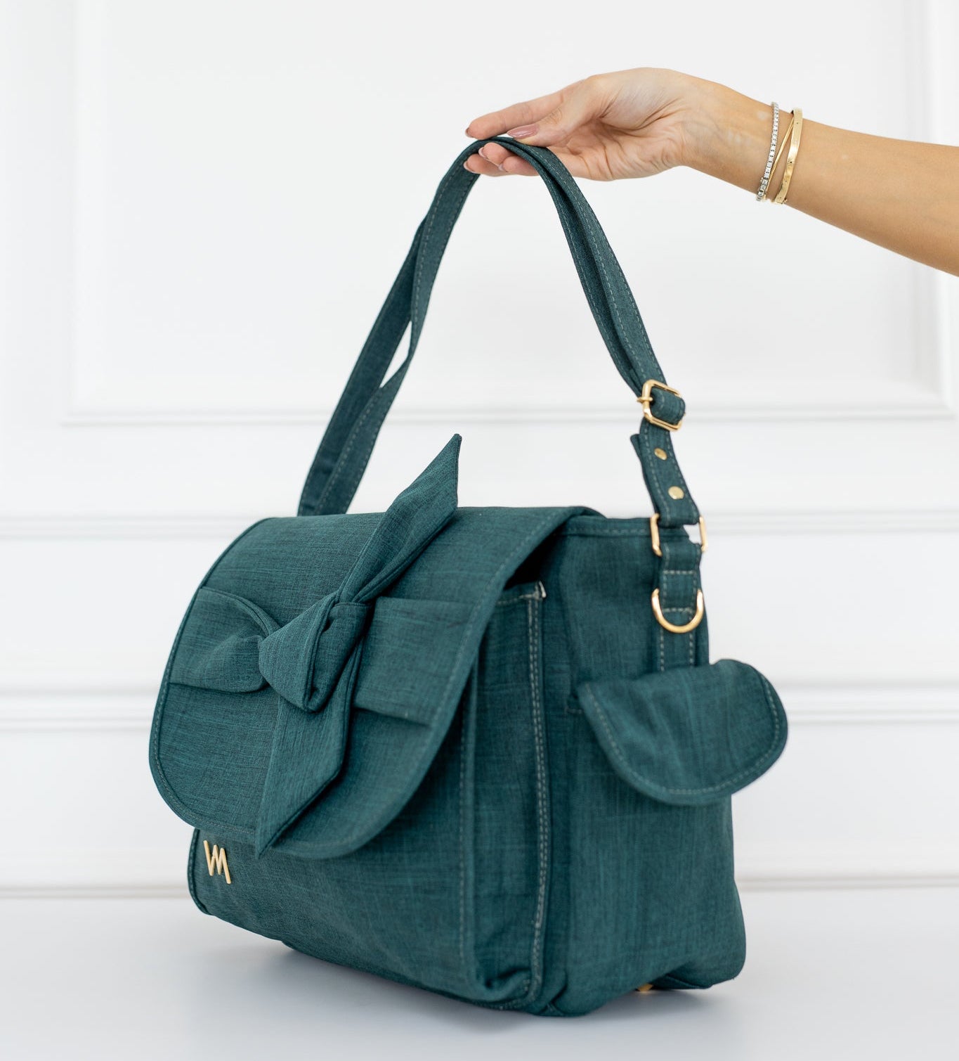A Louise Verde da Coleção Nós traz um toque suave e delicado, perfeito para mamães que valorizam elegância e praticidade. Com tecido impermeável de alta qualidade, ela oferece dois compartimentos espaçosos e fechamento em imã para facilitar o acesso. A alça tira colo garante conforto durante o uso, enquanto o trocador simples incluso facilita as trocas em qualquer momento. Personalize com suas iniciais para uma bolsa única e especial.