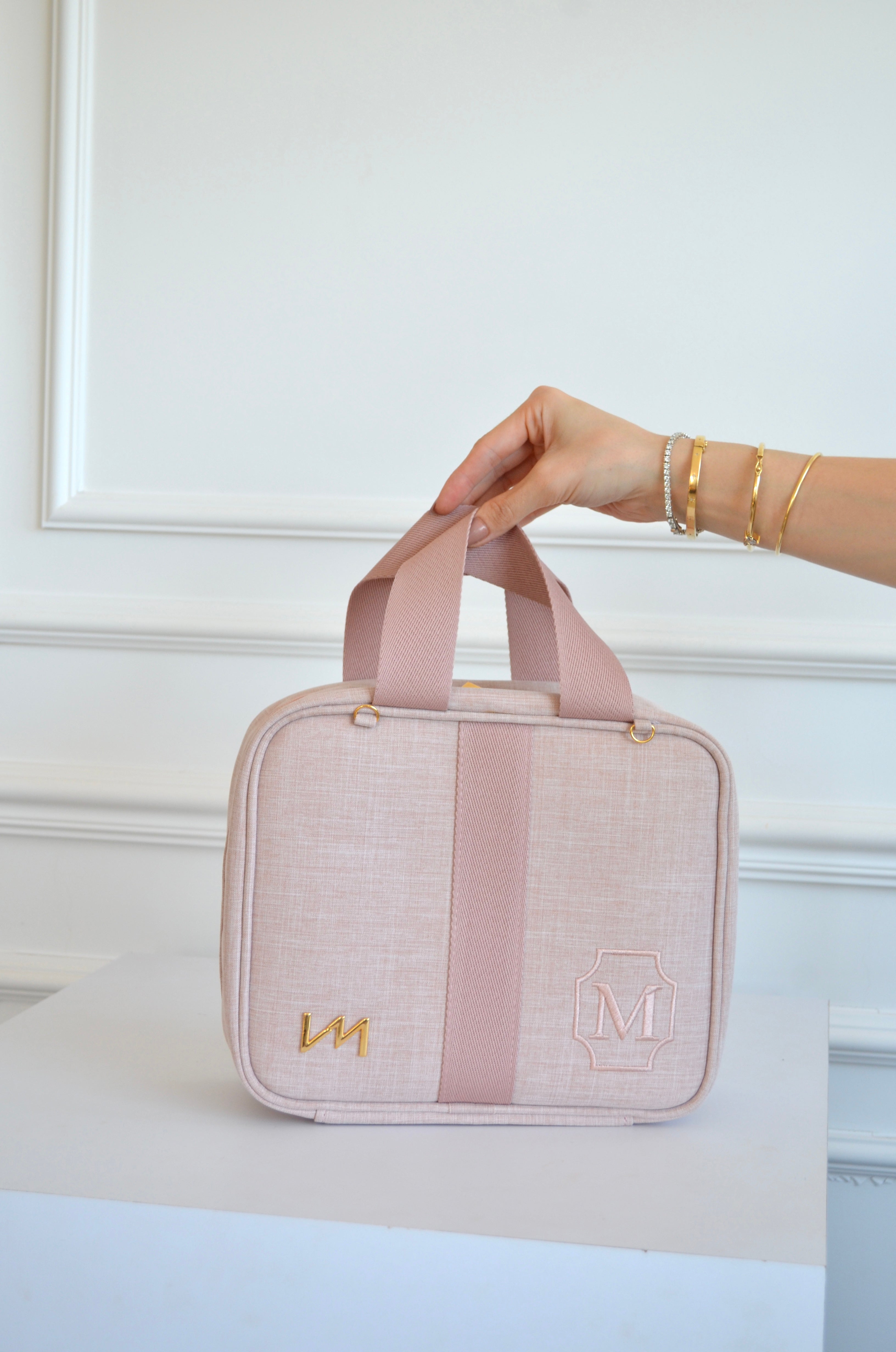 - Frasqueira Térmica Glam linho Rosé com fita rosé bordado brasão M OUTLET