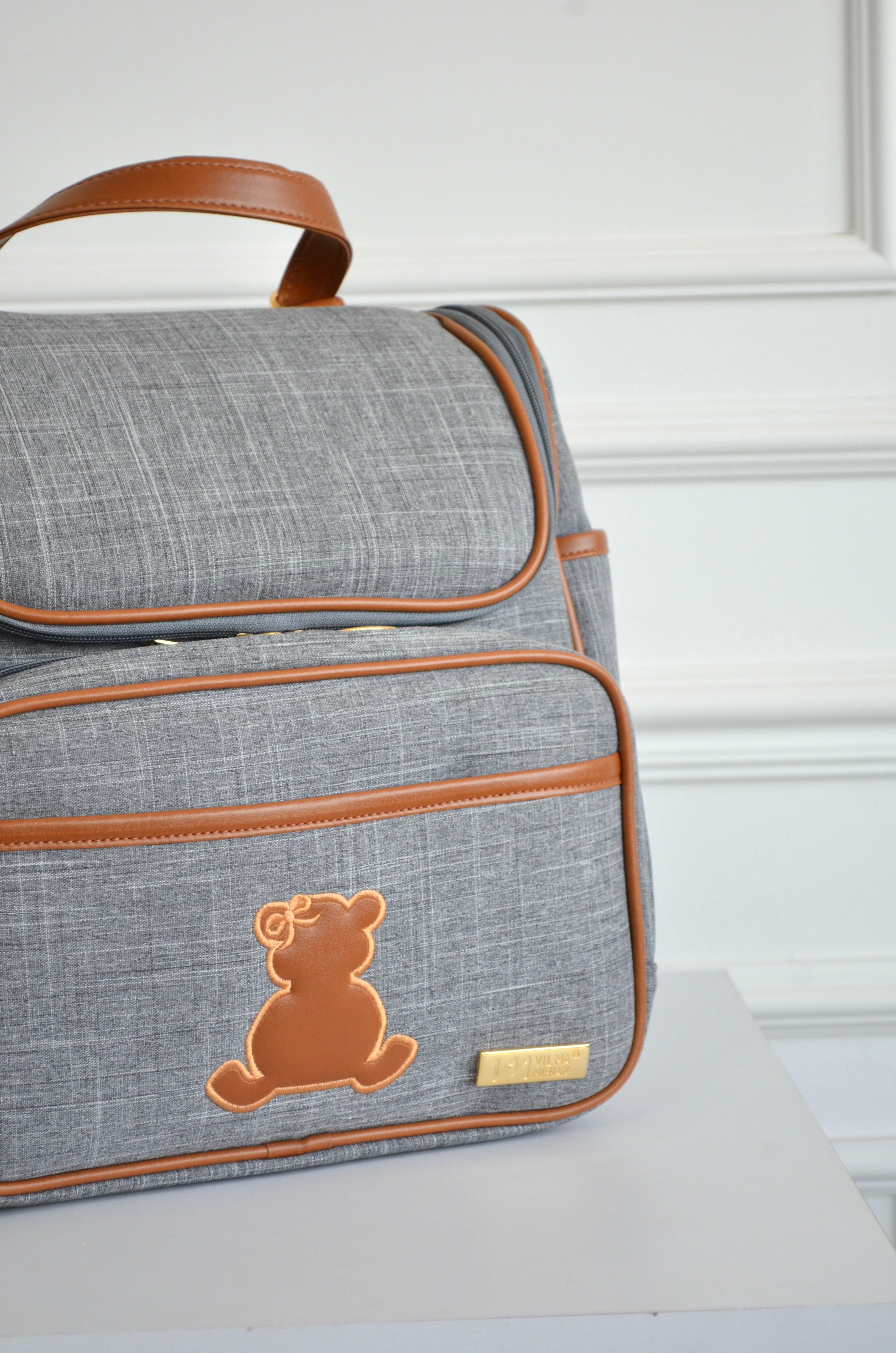 - Mochila 2 em 1 linho cinza com caramelo bordado ursinha OUTLET com 30% de desconto